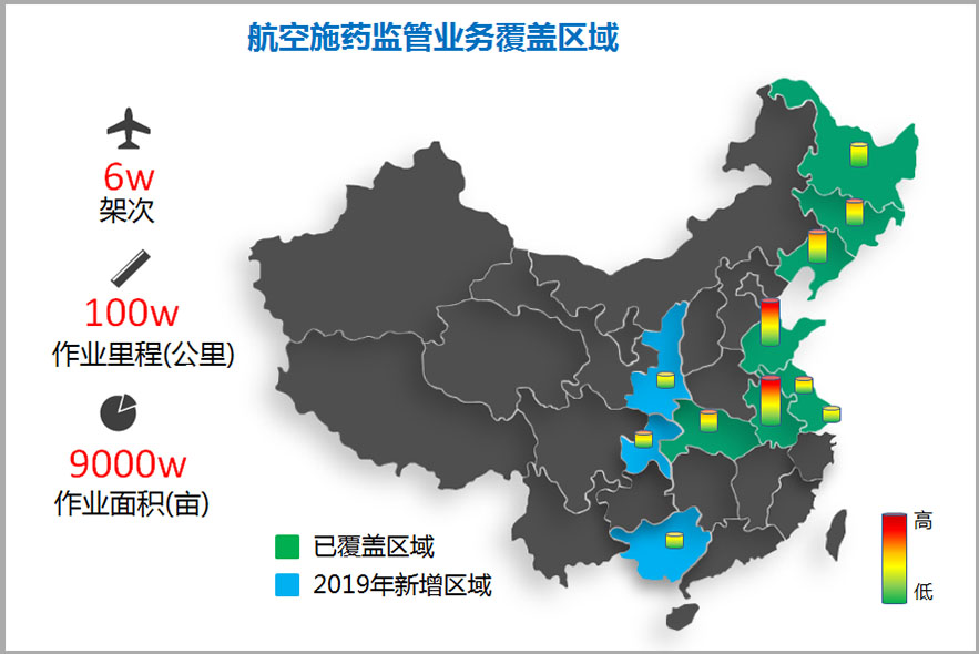 截止2019年底,已監管施藥作業面積9000余萬畝,作業區域覆蓋山東、安徽、重慶、江蘇、東三省等十多個省市地區